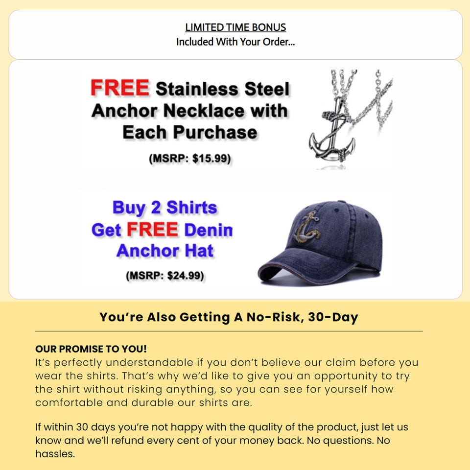 Receive a FREE Stainless Steel Anchor Necklace with Each Purchase! Buy Any 2 Shirts and Receive An Additional Denim Anchor Hat FREE